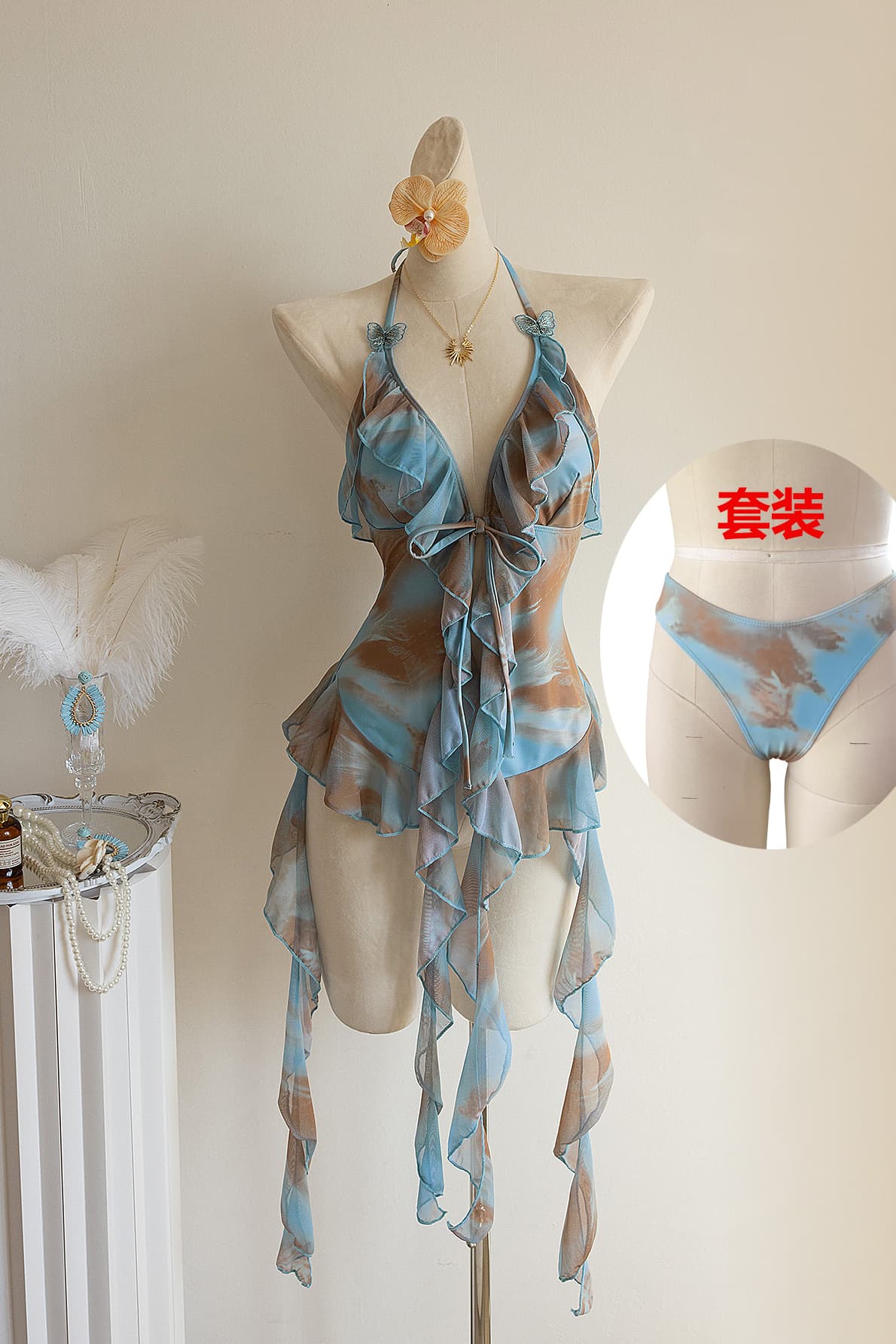 Blue Heart-Print Backless Bikini Set