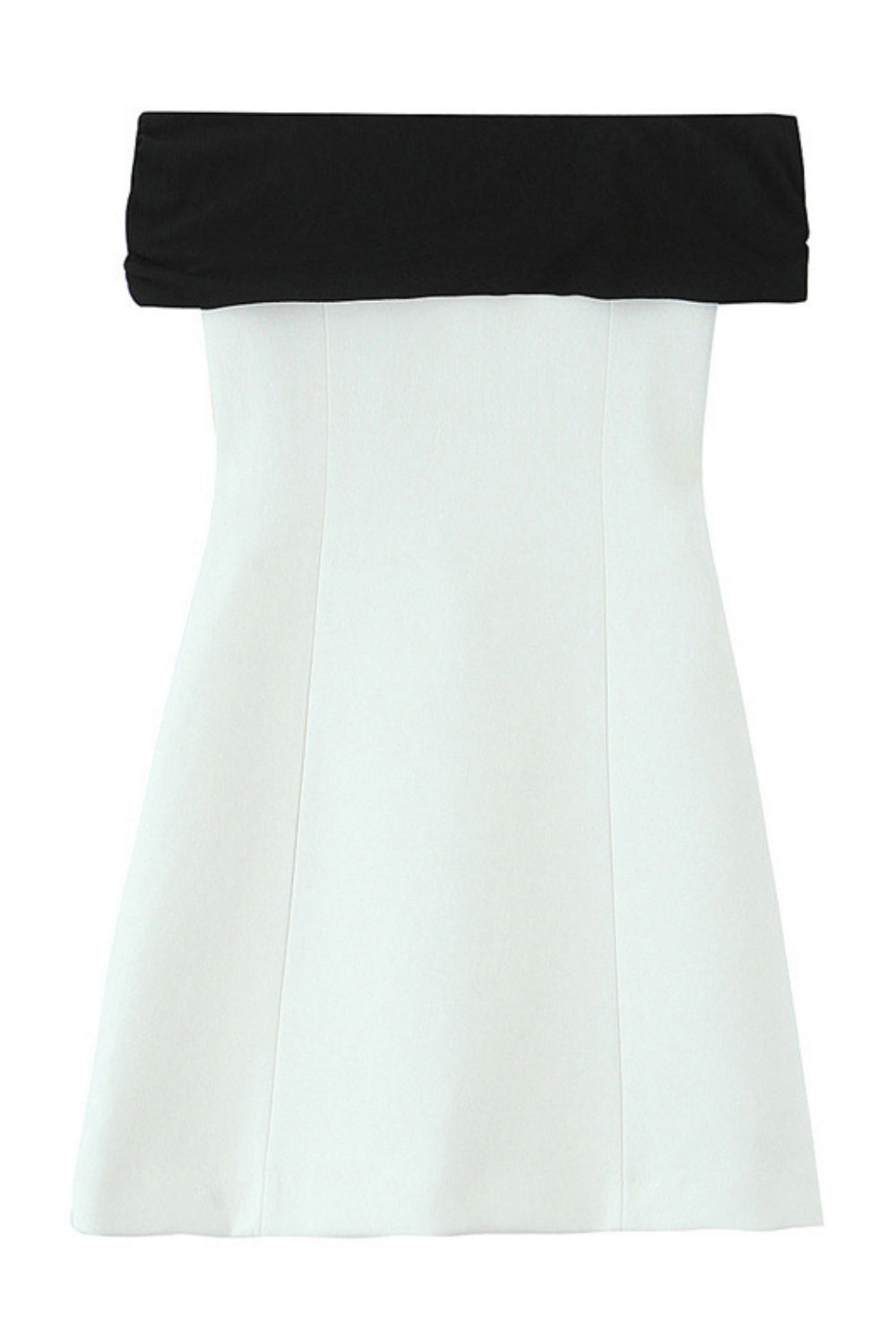This party dress features a sleek black or white satin fabric with an A-line silhouette. It has an off-the-shoulder neckline and sleeveless design, falling just above the knee for a flattering fit.