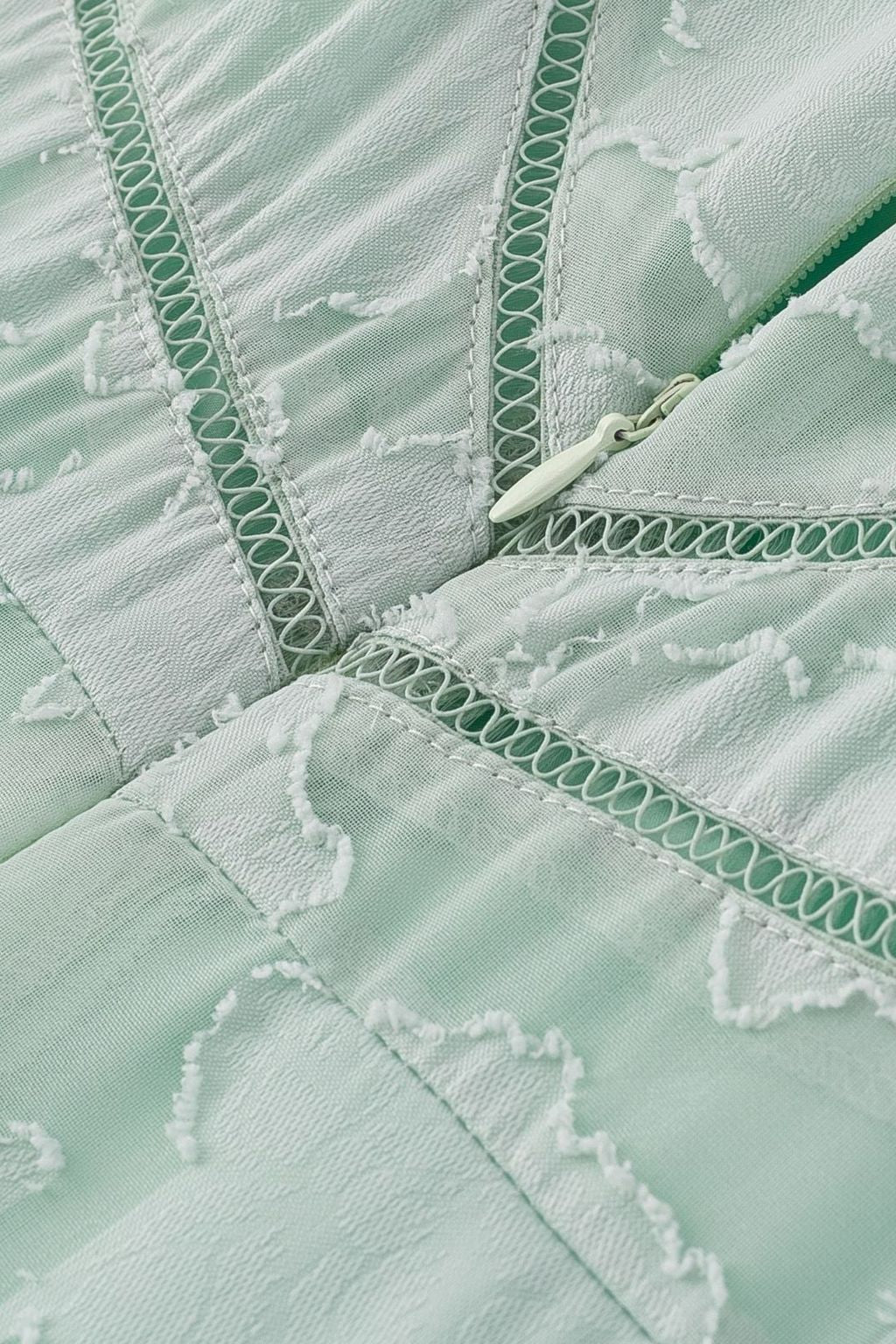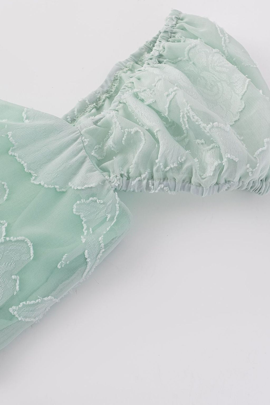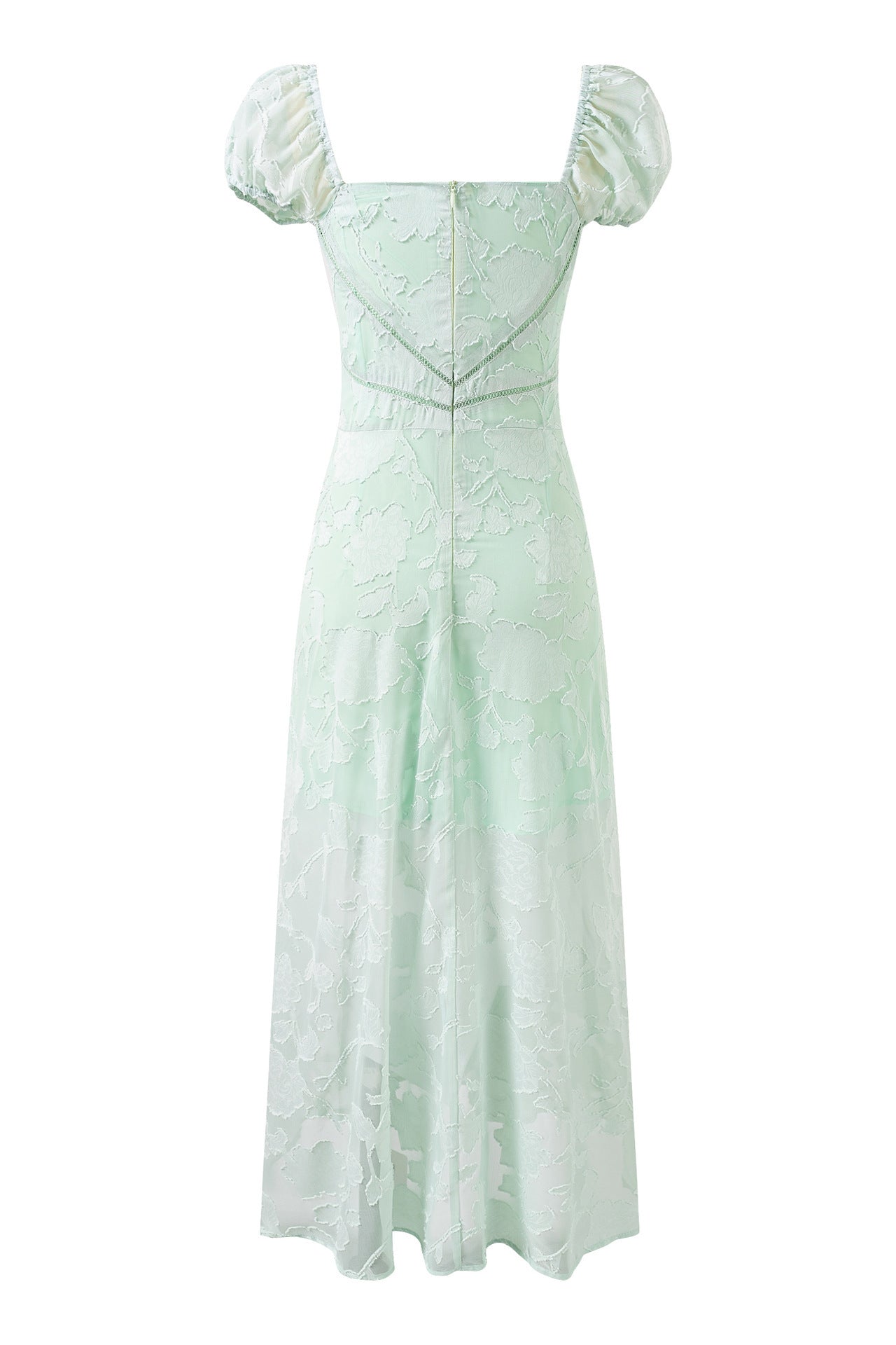This long green dress features a floral pattern and is made from polyester. It has a square neckline and puff sleeves, with a zip-up closure at the back for easy wear.