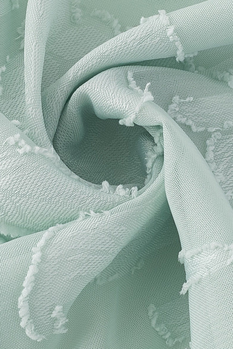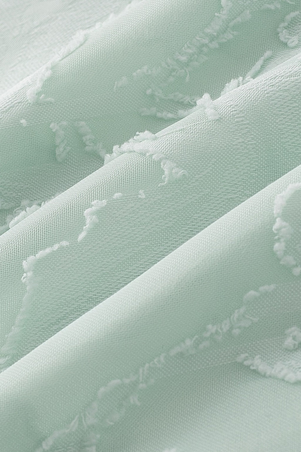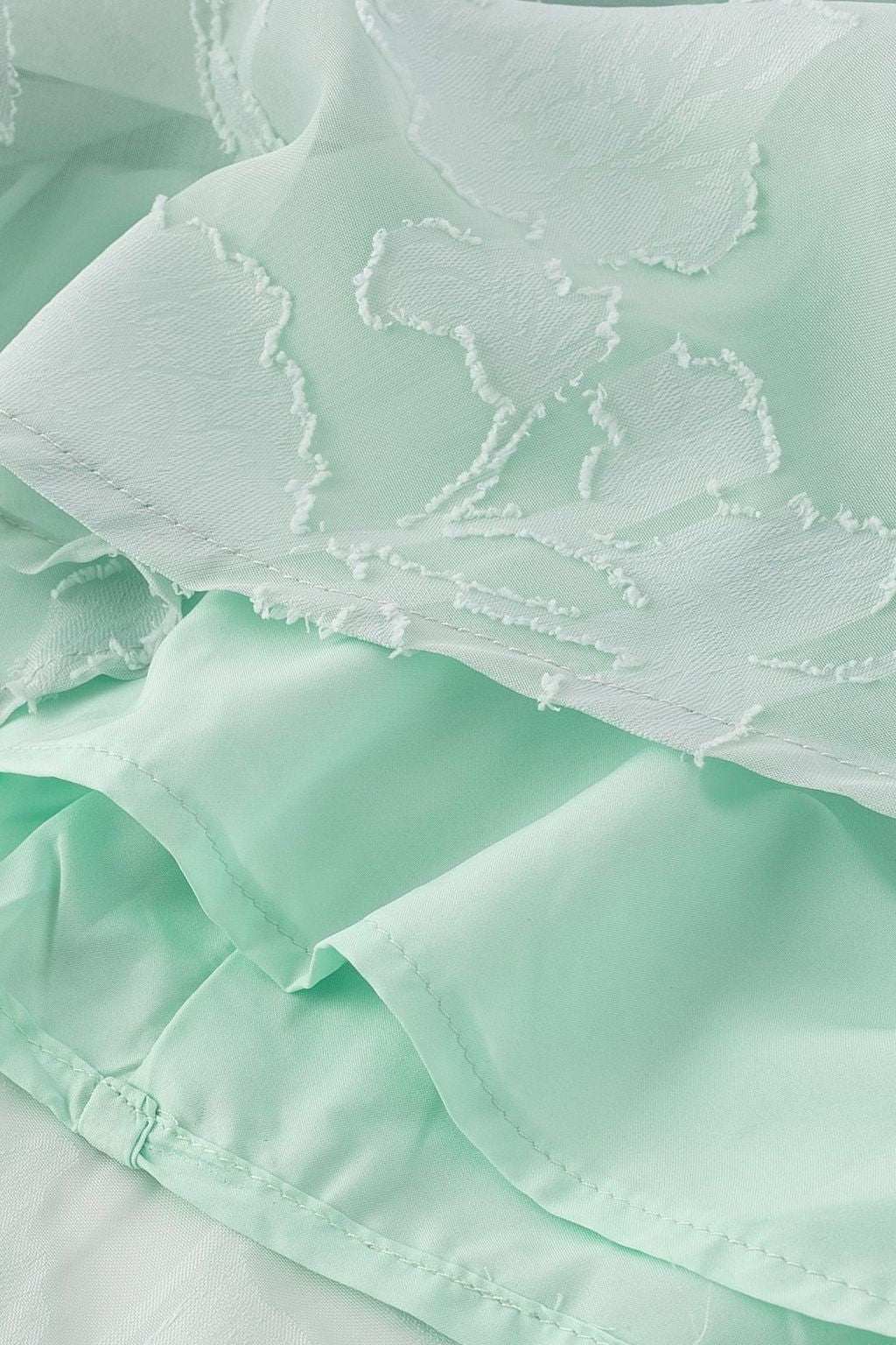 This long green dress features a floral pattern and is made from polyester. It has a square neckline and puff sleeves, with a zip-up closure at the back for easy wear.
