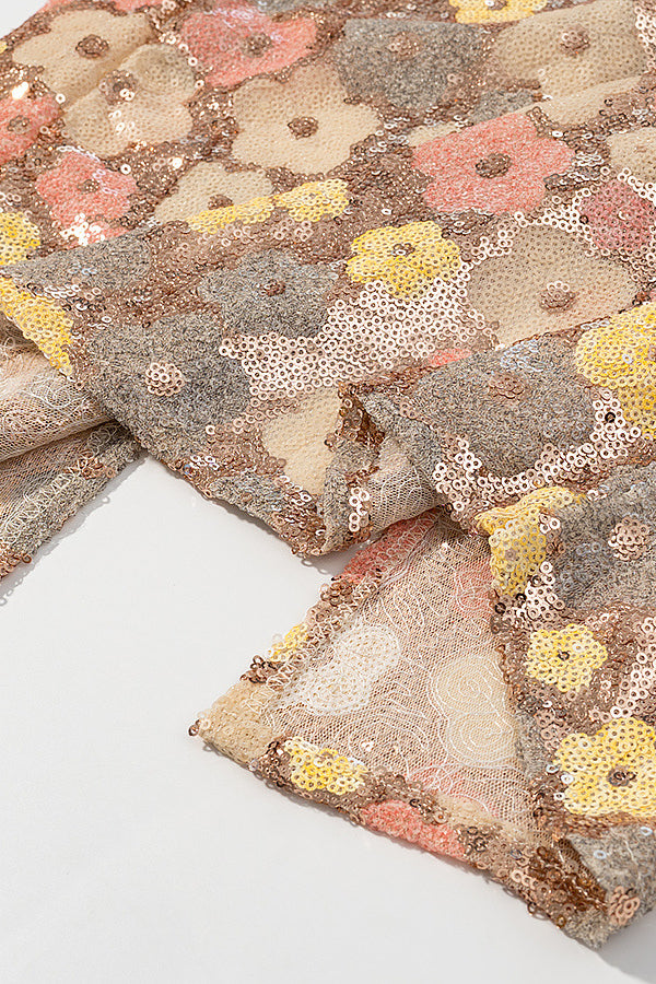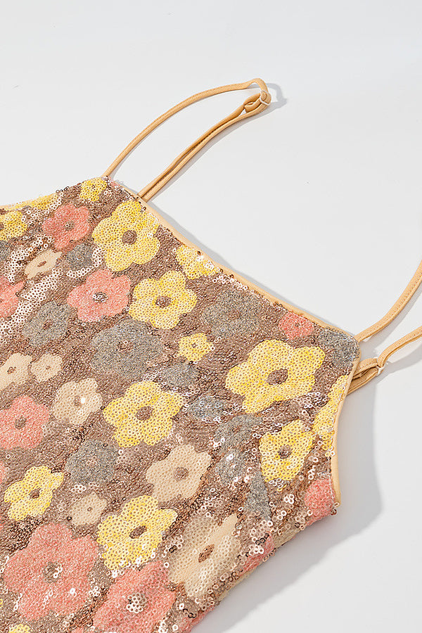 This maxi-length dress in gold features floral sequin detailing and a square neckline. It is sleeveless and fastens with a zip at the back, combining elegance with comfort for special occasions.