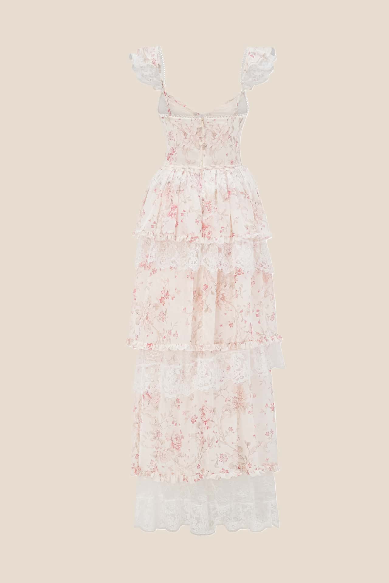 Pink Floral Lace Ruffle Straps Tiered Dress
