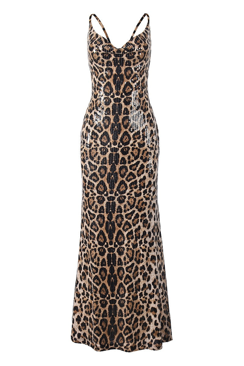 Leopard Sequin Cowl Neck Fitted Long Dress