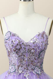 Delight your senses in beautiful lavender, with a beaded bodice and tulle skirt finished with striking ruffles. An A-line silhouette, spaghetti straps, and a lace-up back create a long, elegant look that you'll love!