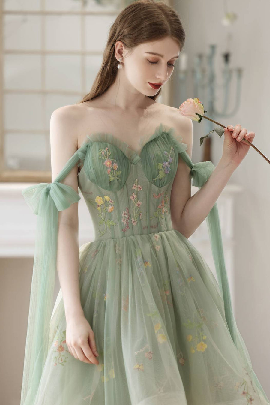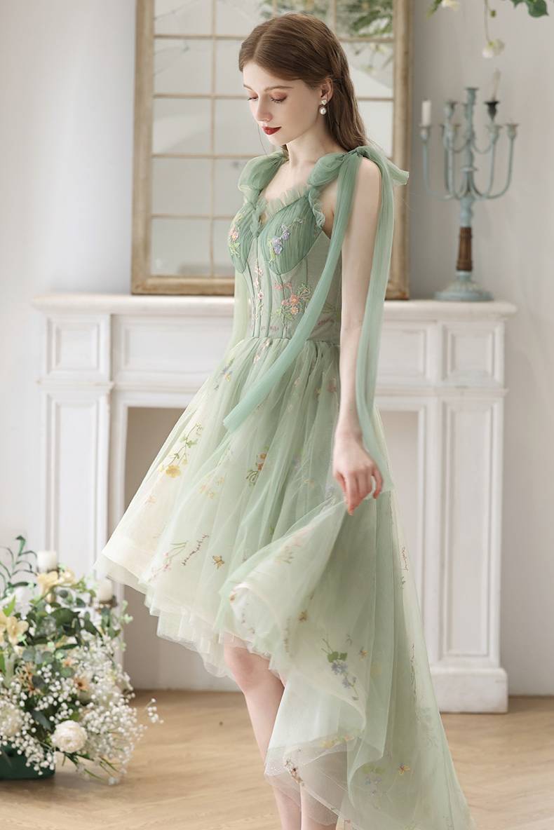 Emerge in emerald in this tulle-esc frock, with a whimsical floral embroidery on the A-line silhouette! The bodice is sheer-ly delightful with the tie shoulder straps and boning—the high-low hemline is laced up at the back!