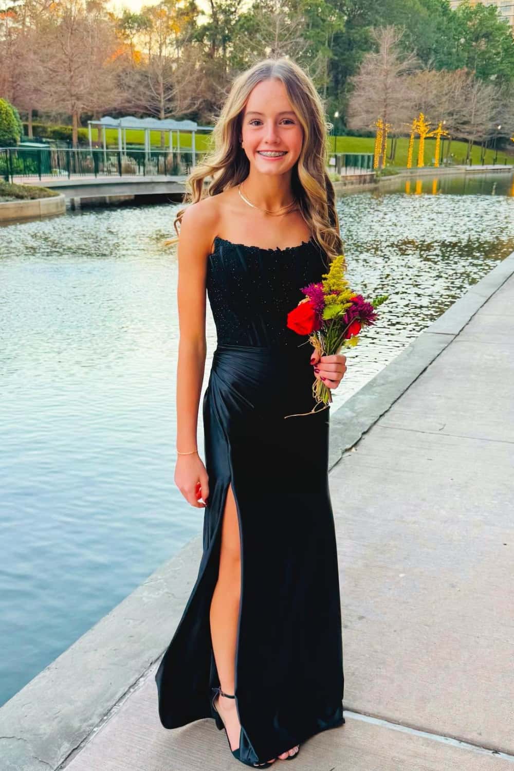 This formal dress boasts a stunning fuchsia hue and features a strapless neckline with intricate lace detailing on the fitted bodice. The mermaid silhouette and side slit add a touch of sophistication, while the zipper closure on the back ensures a secure fit. Made from luxurious satin material, this dress is guaranteed to make you stand out at any formal event.