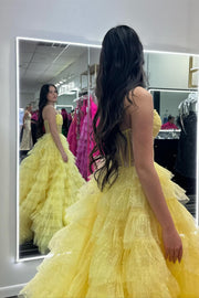 Luscious black tulle, a strapless neckline, and playful tiered ruffles, this long formal dress is guaranteed to wow and comes complete with a zip-up back and built-in bra for convenience.