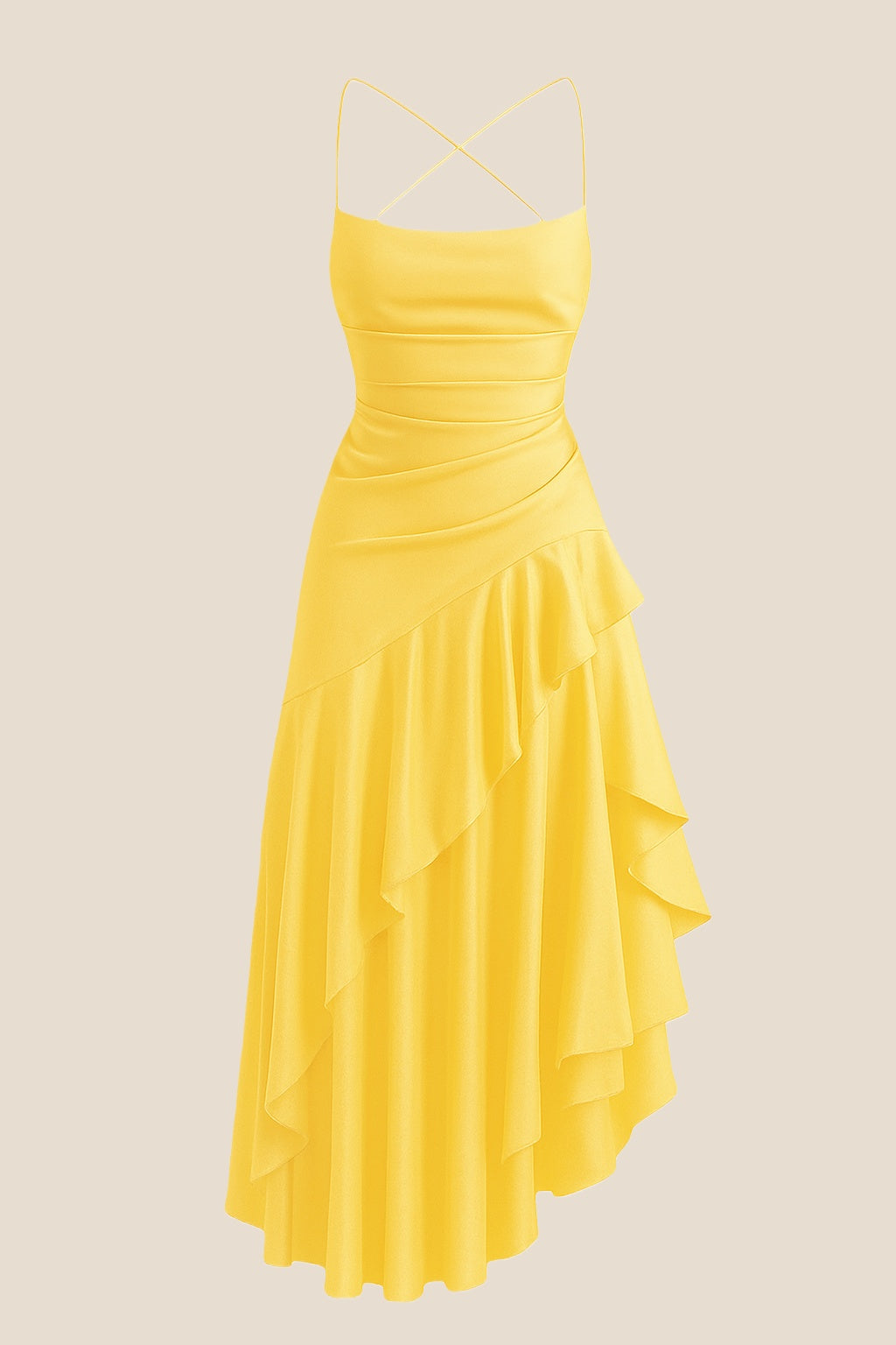 This elegant party dress features a vibrant red satin fabric with a flattering A-line shape. It has delicate spaghetti straps and a ruffled skirt with a stylish slit, creating a graceful floor-length look. The lace-up back adds a charming finishing touch for a perfect fit.