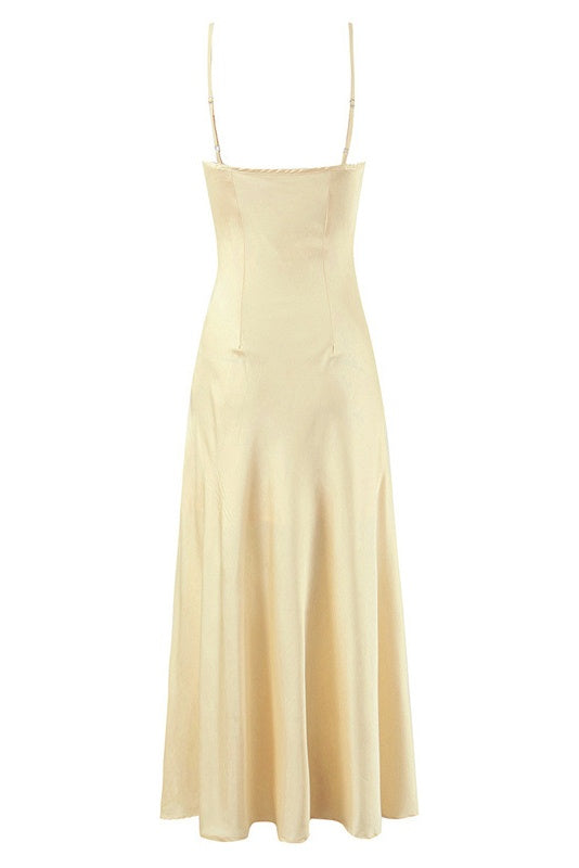 Elevate your wardrobe with this charming A-line dress that combines elegance and comfort. Crafted from luxurious satin in a cheerful yellow hue, it features a flattering V-neckline and delicate spaghetti straps. The standout lace print adorning the chest adds a touch of sophistication, while the convenient side zipper ensures an easy fit. Perfect for any occasion where you want to feel confident and beautiful.