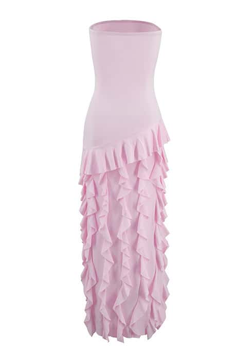 This long dress features a supportive strapless neckline and is crafted from stretchy black spandex for comfortable wear. It includes a ruffled skirt with a stylish slit and a side zipper for easy dressing.