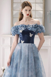 Off the Shoulder Blue Velvet Tulle Princess Gown