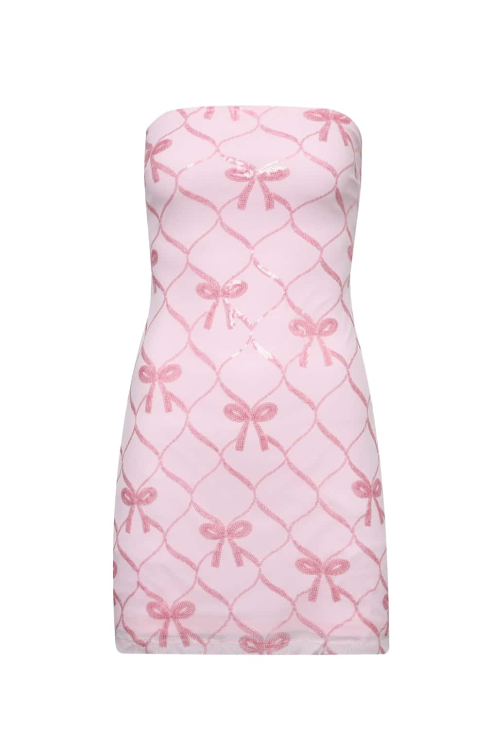 Turn heads in this stunning pink dress featuring a fitted silhouette and eye-catching sequin embellishments with delicate bows. The strapless neckline offers a sophisticated look, while the lace-up back detail adds intrigue and personality. An excellent choice for parties and special occasions.